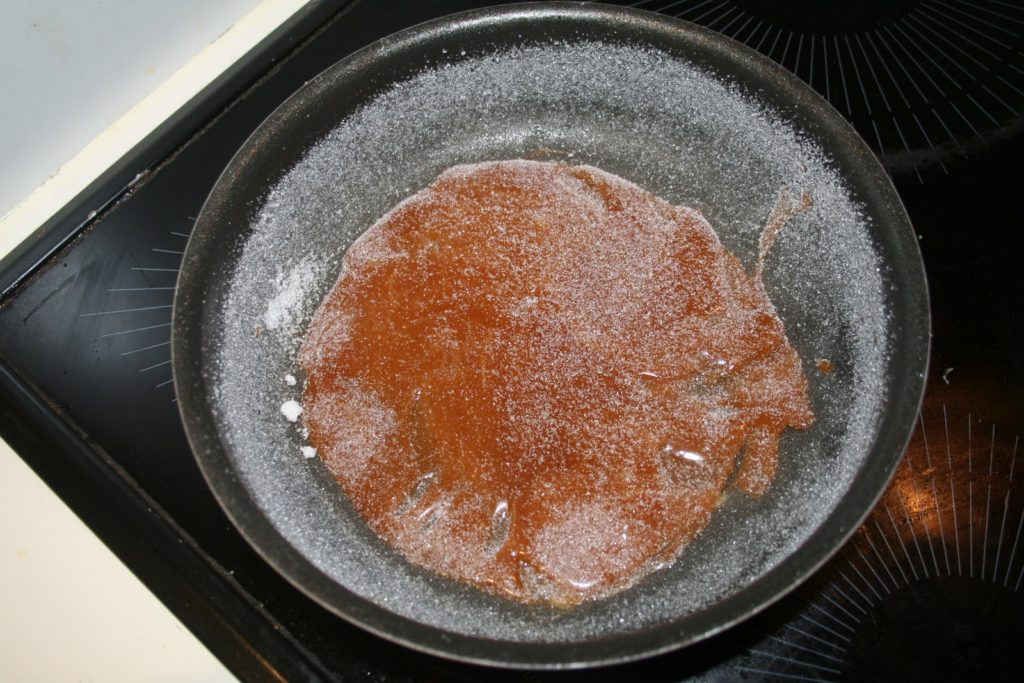 Laisser refroidir, puis mettre 10 g de sucre et secouer la poêle pour qu’il adhère sur le bord.