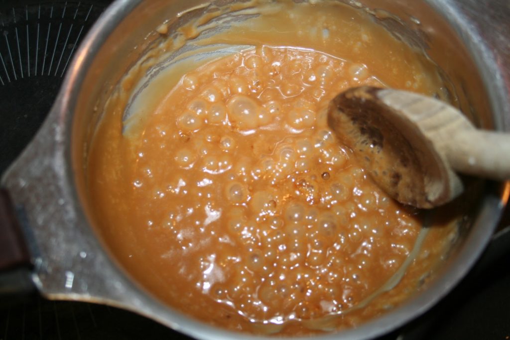 Conseil de Bernard: alors pourquoi je le fais dans une casserole?? Car je passe un coup de bombe à graisse démoulante (que j’utilise dans les canelés) dans le moule que j’utilise pour faire la tarte. De plus, dans le cas de petites tartes, il est plus facile de préparer le caramel et de le verser dans les moules concernés par la suite…