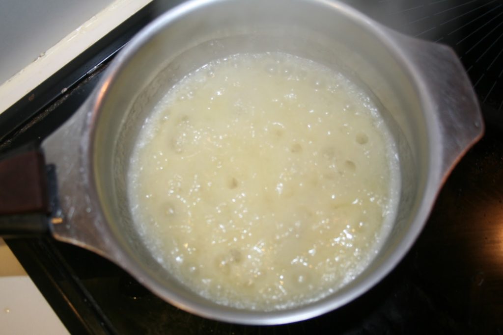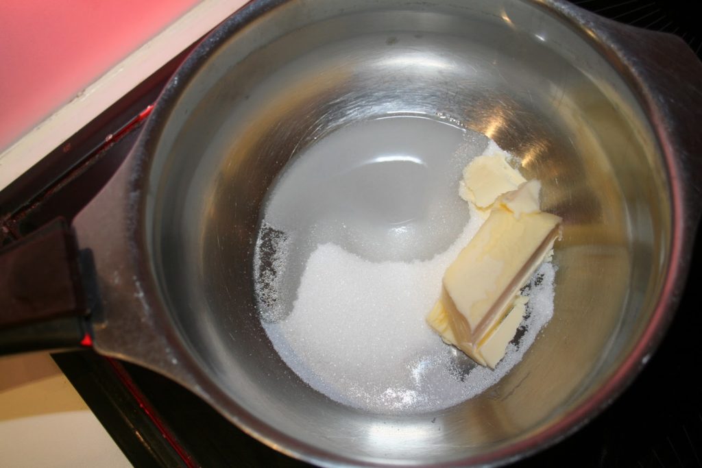 Mettre 60g de sucre et 40g de beurre (là je mets du beurre salé) et un trait d’eau dans la casserole sur feu modéré.