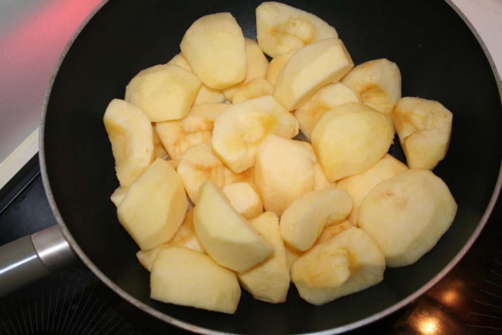 Avec une cuiller en bois ou encore mieux, en secouant la poêle et en les faisant sauter, cuire les pommes. Le feu étant fort, il faut surveiller mais cela ne risque pas de brûler car l’eau que rendent les pommes empêche de brûler le caramel. Mais il faut rester présent! Les pommes doivent être tendres et légèrement caramélisées. Laisser refroidir hors du feu, toujours dans la poêle.