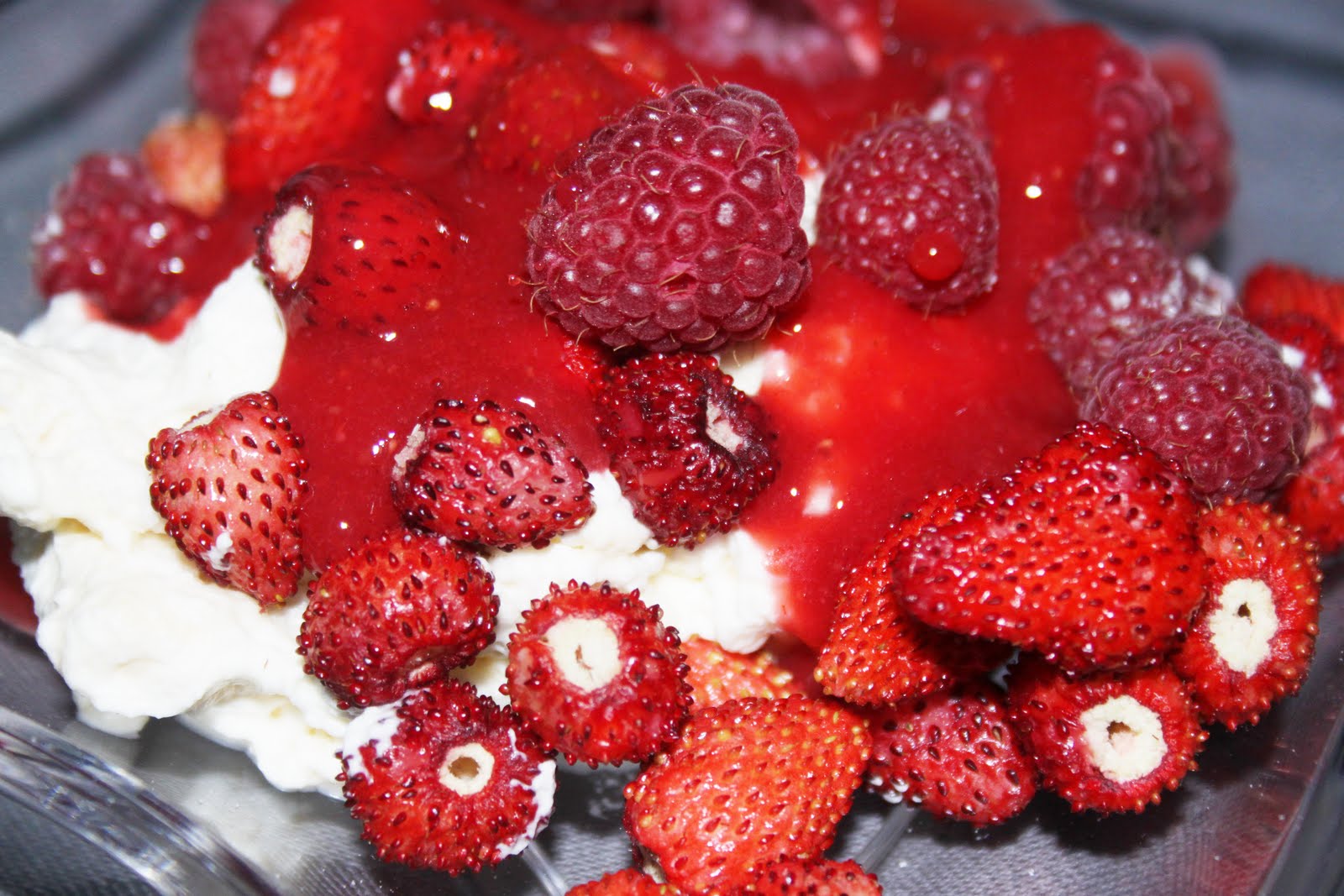 Pour le dessert, une idée simple, mais mise en valeur par des produits de première qualité. Une chantilly garnie de brisures de meringue, framboises et fraises des bois (tellement parfumées!!) et coulis de fruits rouges. Un dessert frais, tout simplement délicieux.