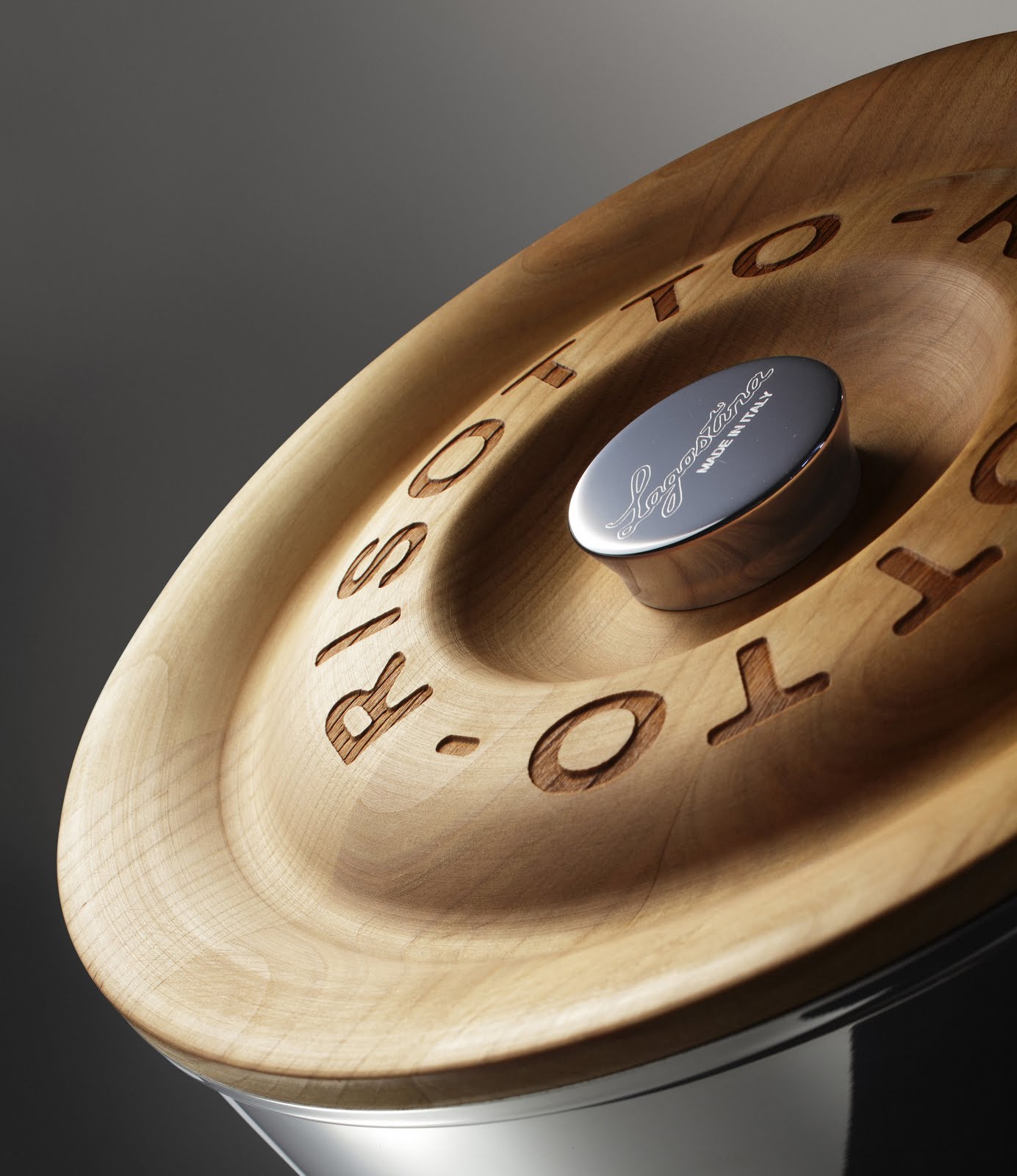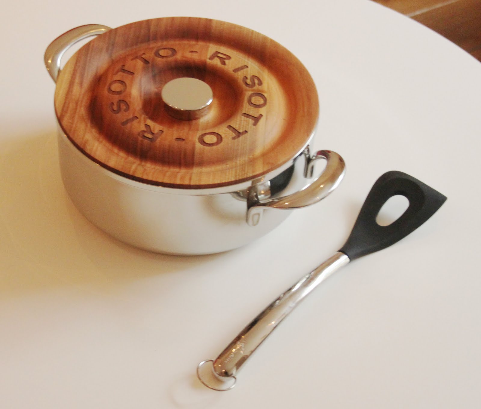 Lagostina nous a bien sûr fait découvrir (et saliver d’envie d’acheter!) la casserole (risottiera) et sa cuiller à risotto… Le couvercle est réalisé en bois de cerisier et peut se retourner pour servir de dessous de plat (pour la casserole). Un objet magnifique dont beaucoup, j’imagine rêvent déjà (moi aussi!).