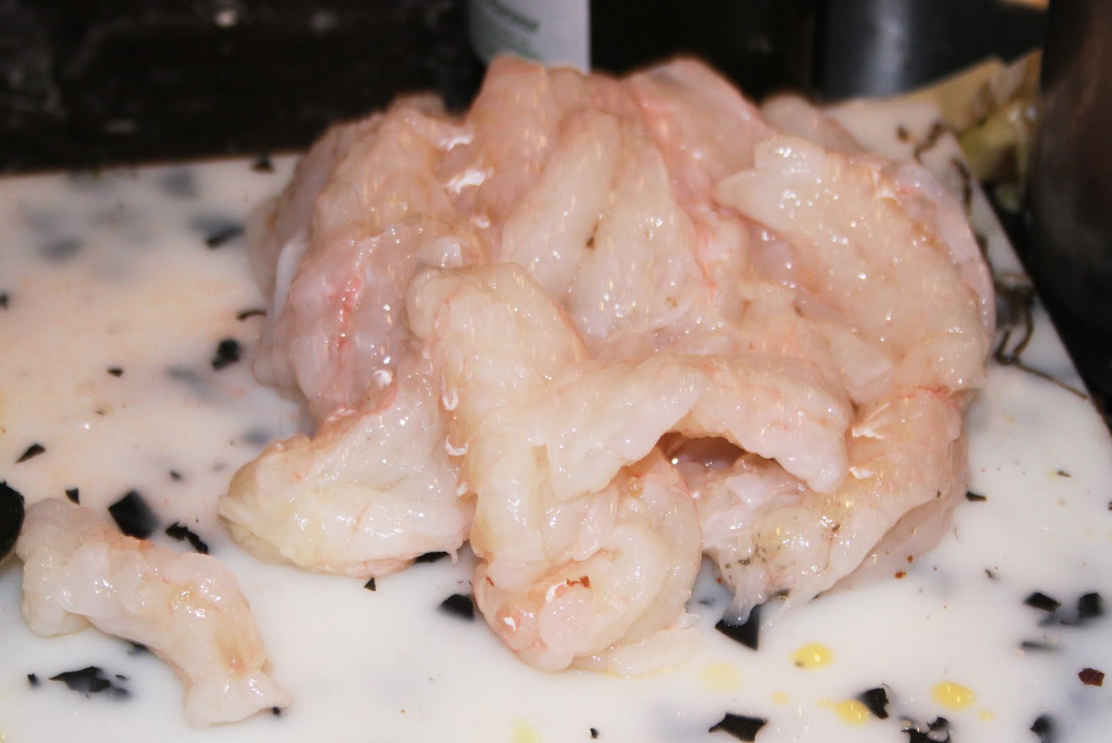 Je suis évidemment allé jeter un coup d’oeil dans la cuisine. Il me fallait bien découvrir comment officiait notre Olympe. En arrivant, j’ai eu l’agréable surprise de tomber sur des langoustines crues décortiquées… J’imaginais déjà les tentations auxquelles je n’allais pouvoir résister!