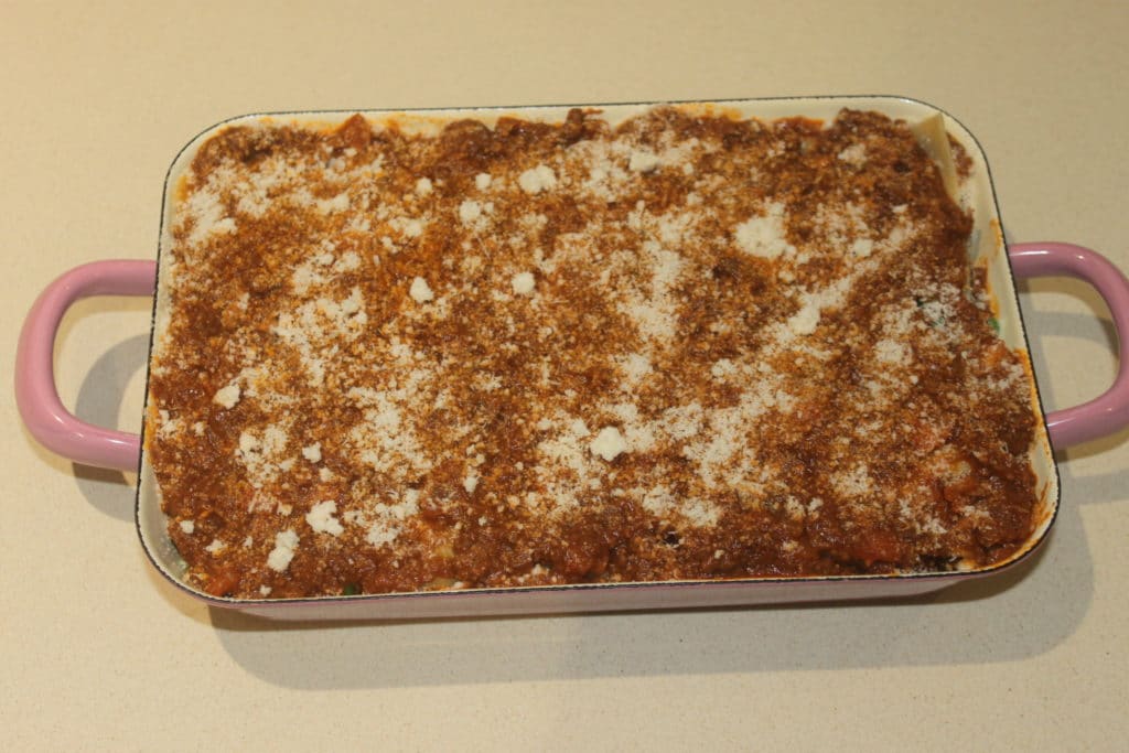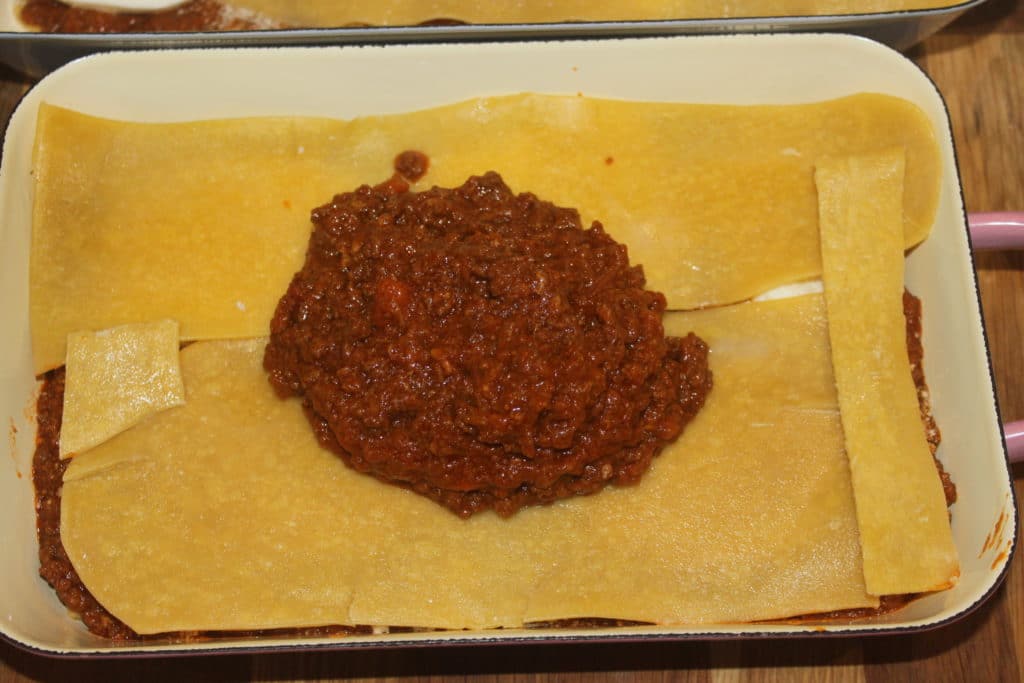 Dans le plat à gratin (j’en ai fait deux petits) mettez une couche de lasagnes dans le fond.