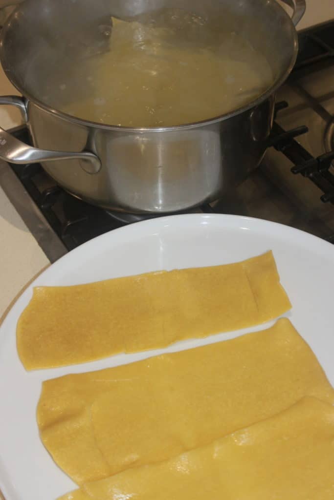 Le jour même (ou on peut passer cette étape si les lasagnes n’ont pas été séchées), faites cuire 30 secondes les lasagnes à l’eau bouillante salée, juste pour les attendrir.