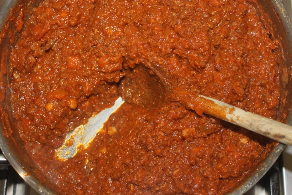 Pour ma part, c’est 7 heures de cuisson la première journée, puis je refais une petite heure de cuisson le lendemain. Faites attention de toujours surveiller pour que le fond ne manque pas d’eau. Ensuite, quand vous avez cuit le tout pendant 6 ou 7 heures, faites réduire et évaporer l’eau pour avoir une sauce relativement consistante.