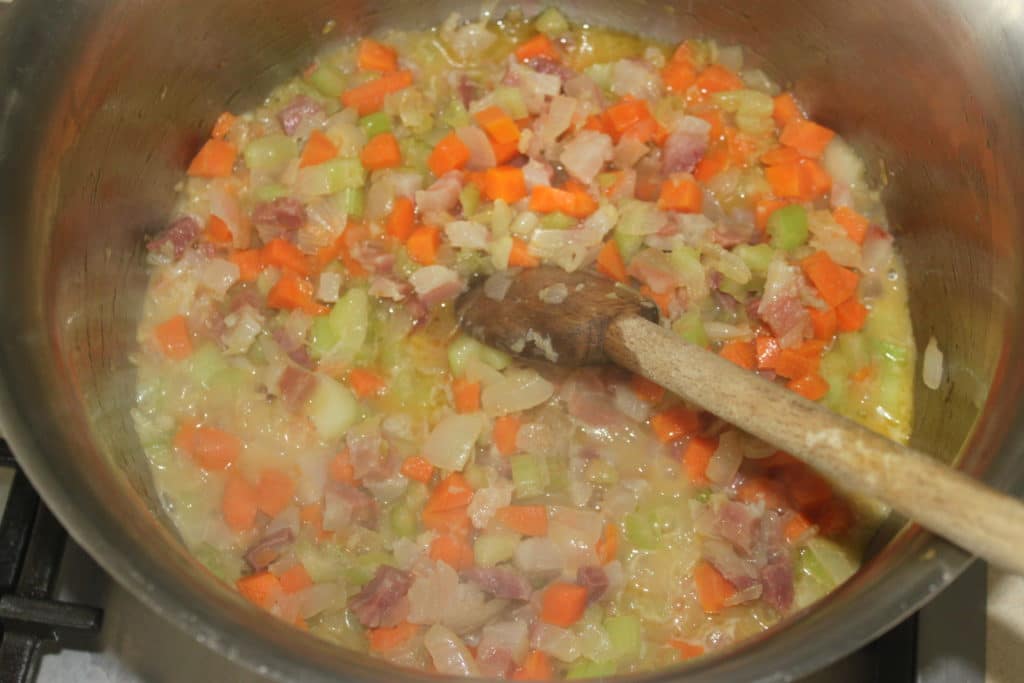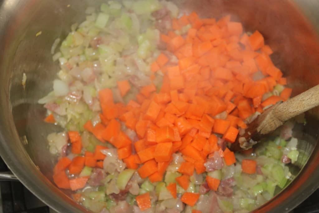 Laissez le tout cuire doucement. Pendant ce temps, coupez en petits morceaux pas trop petits, les branches de céleri.