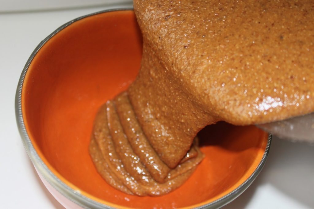 Voici une recette marocaine de la région d’Agadir. C’est une petite merveille de simplicité et de goût. Il s’agit d’une pâte lisse aux amandes broyées avec de l’huile d’argane et légèrement sucrée au miel. Elle se fait traditionnellement avec une pierre qui broie les amandes très finement. Avec un mixeur, on arrive presque à la même texture. Cela ne sera pas aussi fin (le broyage à la pierre donne un amlou incomparable) mais le résultat est absolument délicieux. Un peu de amlou le matin sur du pain et on tient sans problème jusqu’au déjeuner. L’huile d’argane donne un velouté en bouche très doux et la touche de miel est là pour sucrer le tout.