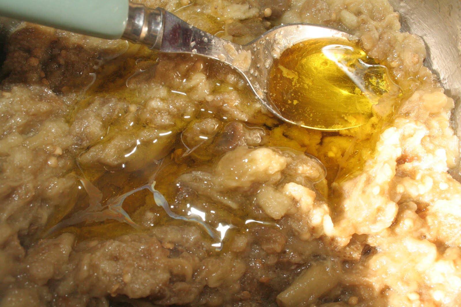 - Laisser refroidir complètement avant de manipuler. Prélever la chair de l’aubergine et placer dans un récipient.