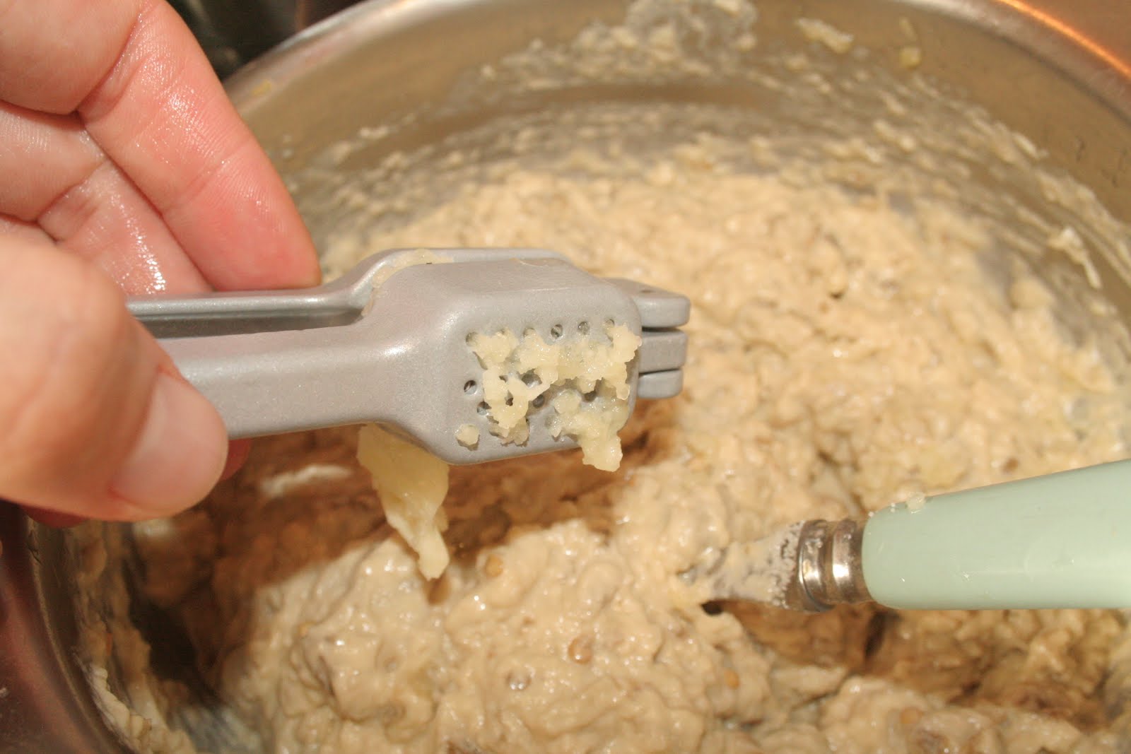 - Écraser les deux gousses d’ail, les ajouter et bien mélanger.