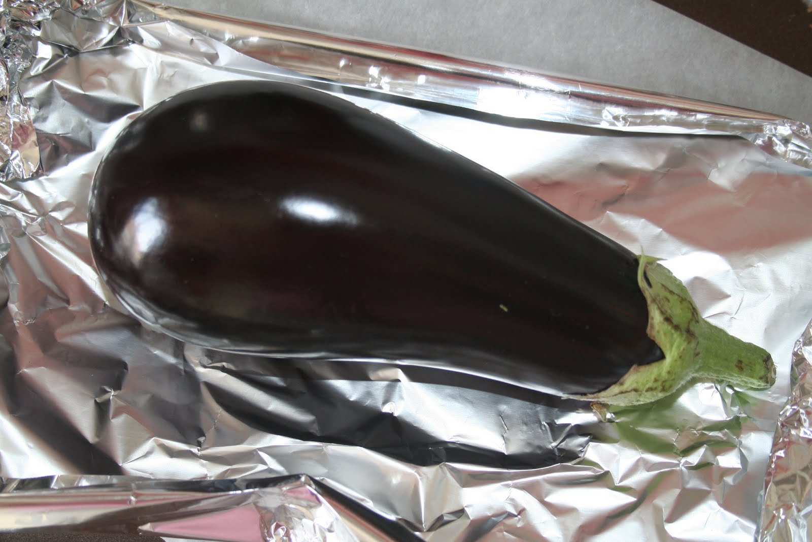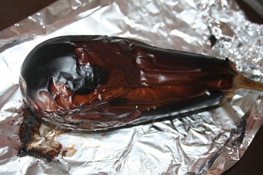 Mettre le four en position « grill » et rôtir l’aubergine en la retournant de temps en temps. La peau va griller et même brûler, mais cela est tout à fait normal. ll faut que l’aubergine soit molle à l’intérieur. Le temps de cuisson dépend tellement du four, que je ne sais pas combien de temps cela peut prendre. Il faut surveiller.