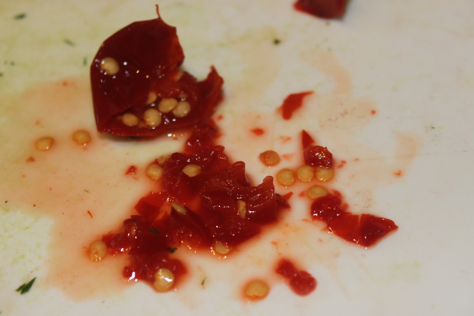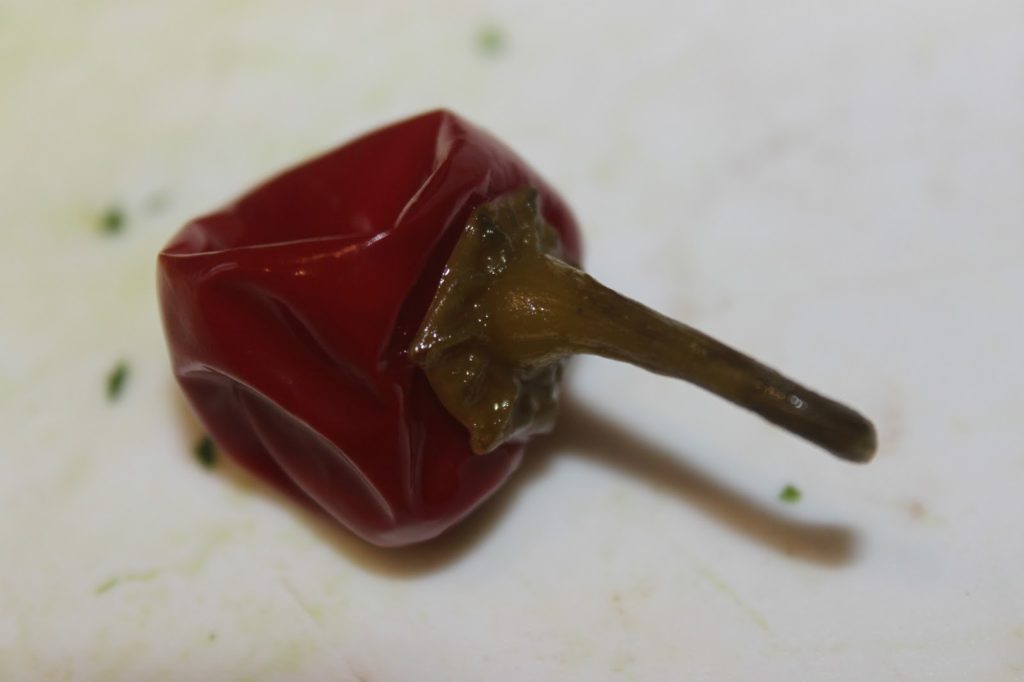 - Prenez-en 4, ôtez la queue et coupez en morceaux, avec les graines. Les piments cerises sont juste piquants. Si vous prenez des piments forts, évitez les graines !!