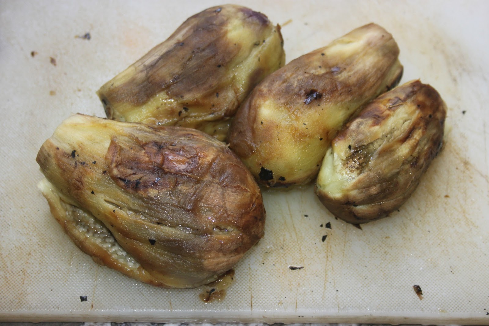 Laissez reposer 20 minutes. La vapeur des aubergines va continuer à les cuire. Épluchez ensuite la peau grillée avec un petit couteau en raclant bien toutes les parties noires.
