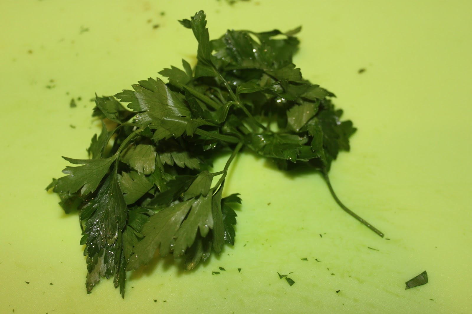 - Prenez quelques tiges de persil plat (deux fois plus que sur la photo, car j’avais la moitié de la recette) et hachez-le finement.