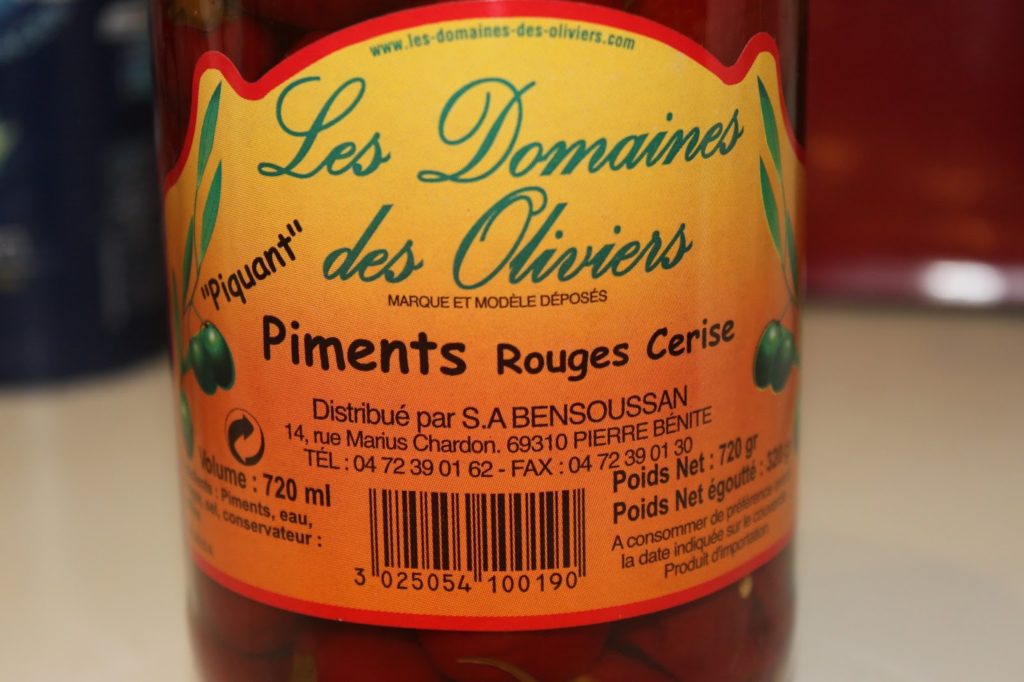 Voici les petits piments cerises au vinaigre. Vous pouvez les remplacer par des piments classiques au vinaigre. Je les ai trouvés dans une épicerie juive à côté de chez moi.