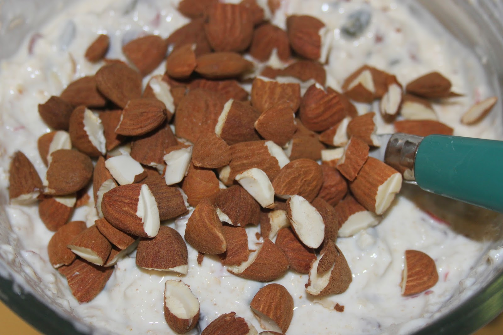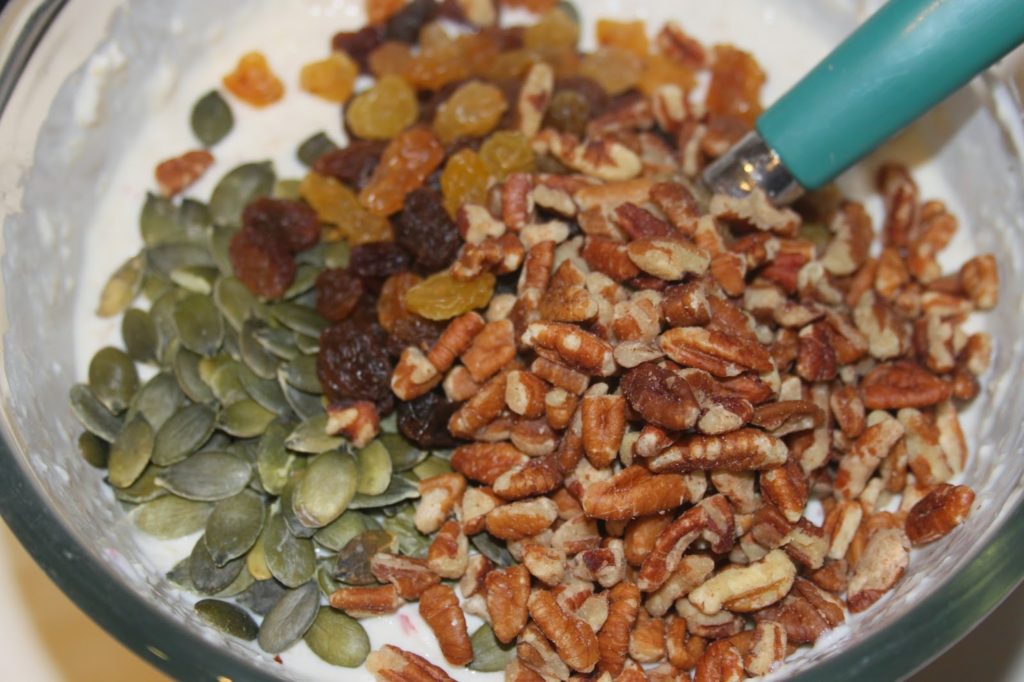 Ajoutez les fruits secs. Vous pouvez en mettre plus ou moins (plus ça devient vraiment riche) ou même les changer: n’hésitez pas à mettre des noix, des noisettes, des noix du brésil, des graines de tournesol, des graines de lin…