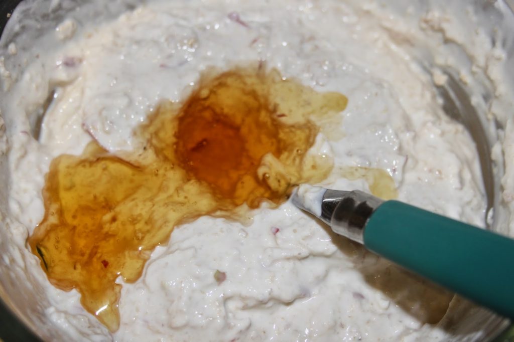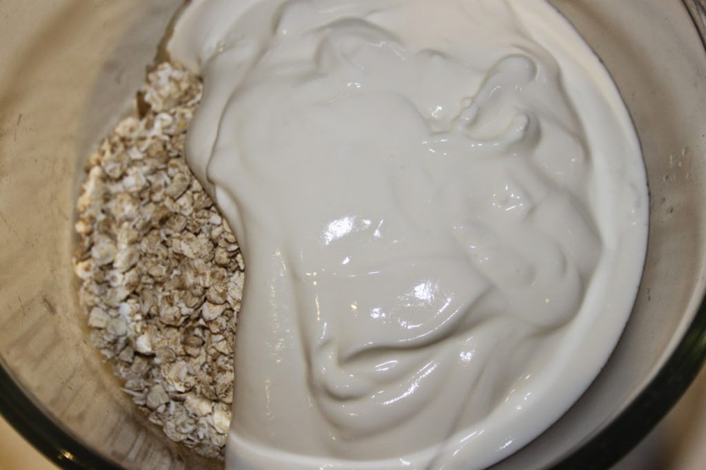 Ajoutez les flocons d’avoine et le yaourt brassé grecque nature. J’ai pris ici du yaourt non réduit en matière grasse… C’est plus crémeux.