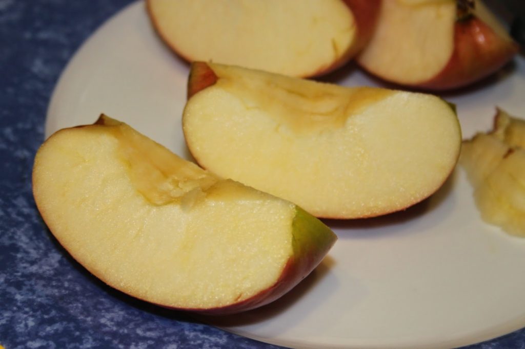 Coupez la pomme en quartiers en enlevant simplement la partie centrale. Je n’ai utilisé ici qu’une demi pomme, ce qui faisait à peu près 100g.