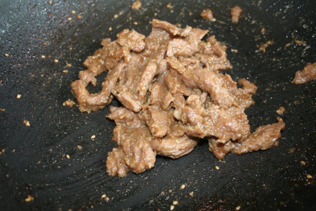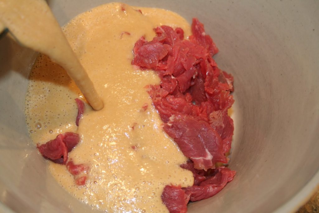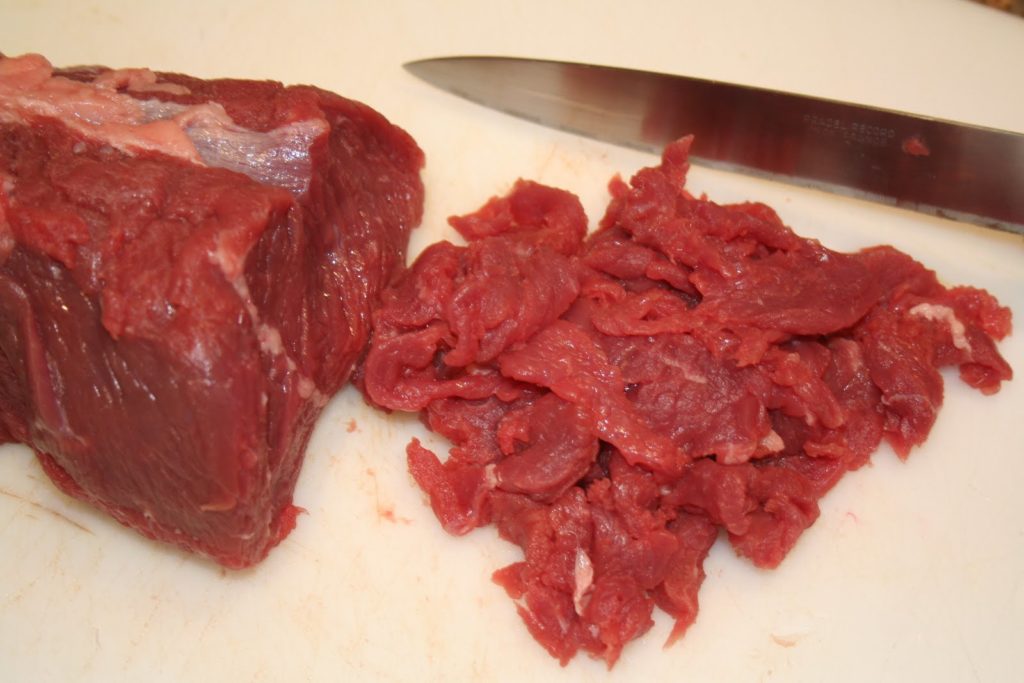 - Couper le boeuf en fines lamelles et les mettre dans une jatte.