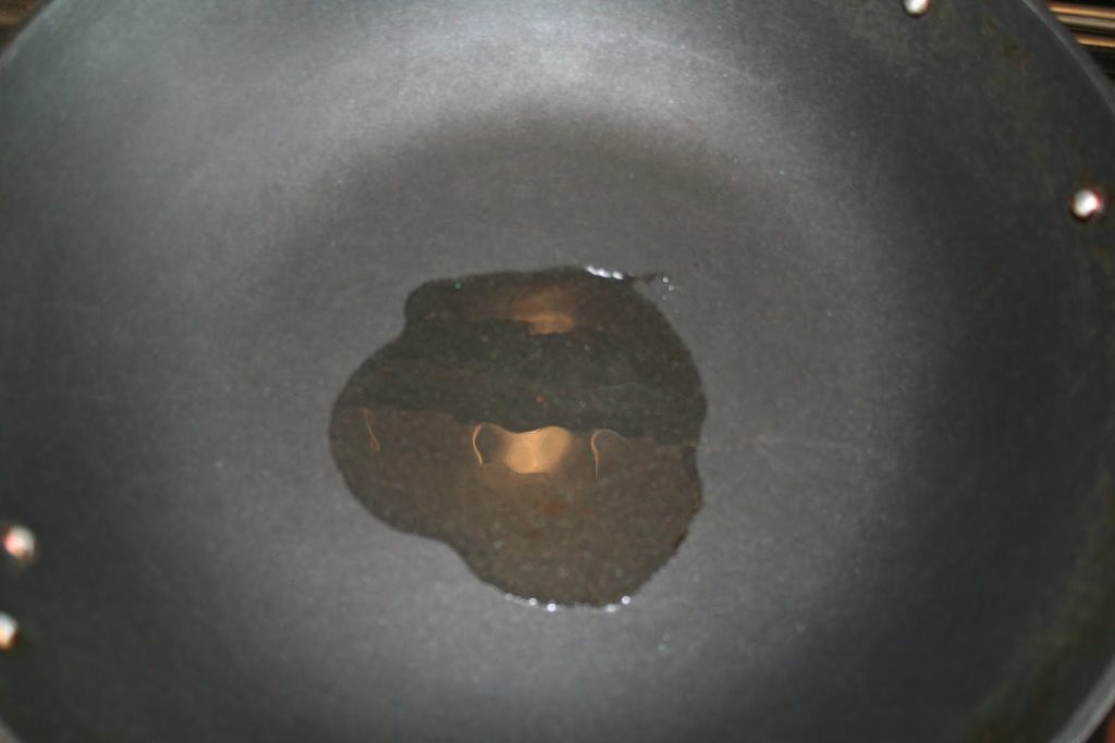 - Après trois heures, prendre un wok, ou une sauteuse, et mettre de l’huile au fond (l’équivalent de 4 cuillerées à soupe!). Mettre sur feu vif.