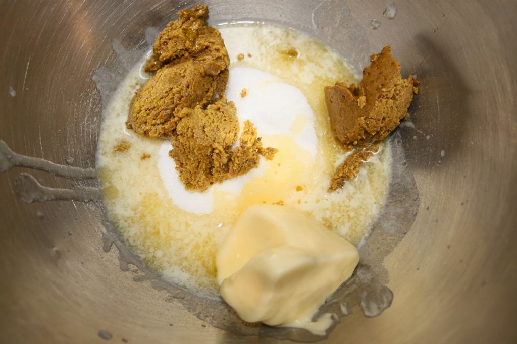 Préchauffez votre four à 170°C. Mettez ensuite le sucre, le beurre très mou (presque fondu) et la pâte de pistache dans un bol.