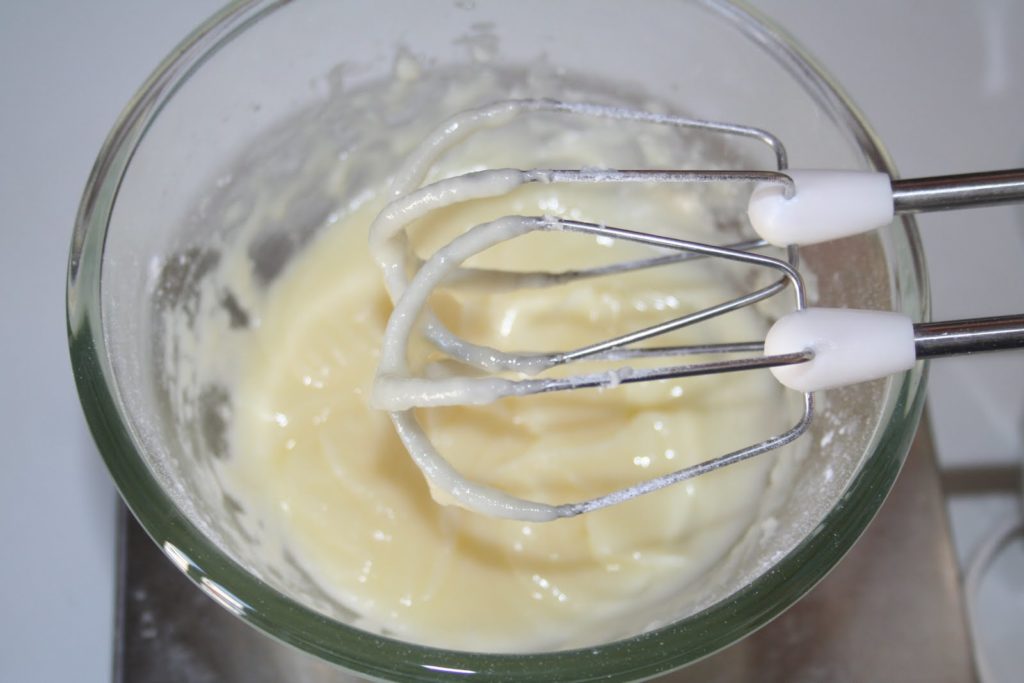 - Lorsque le gâteau est complétement refroidi, préparer le glaçage. Mélanger le sucre glace, le beurre doux très mou au batteur.