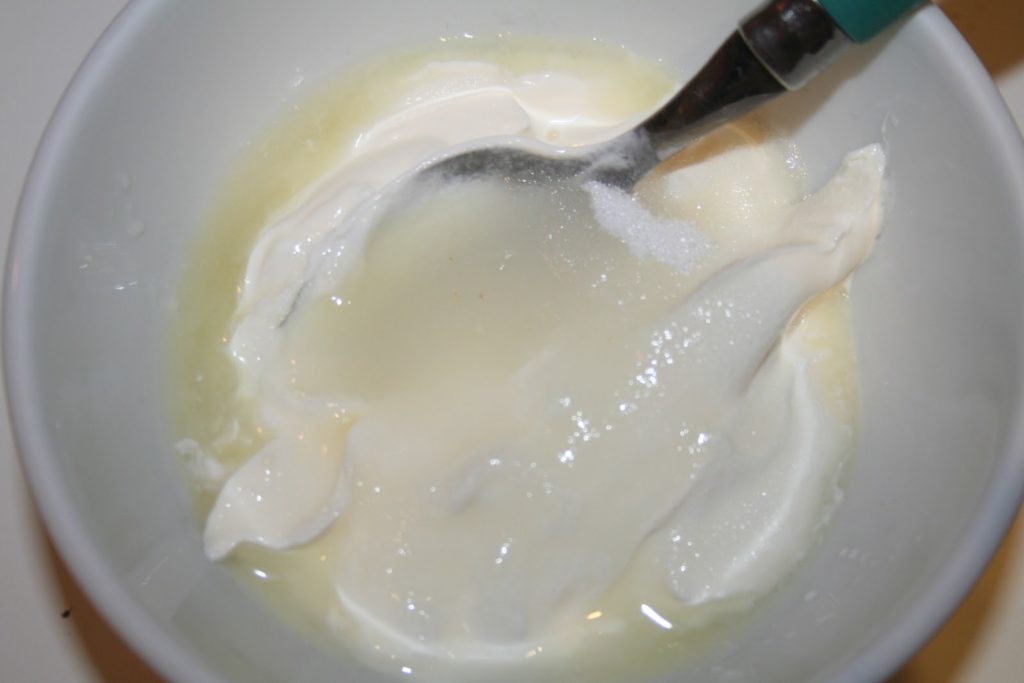 - Le lendemain, préparer le « topping » en mettant la crème fraiche, le sucre et le jus de citron dans un petit bol. Bien mélanger.