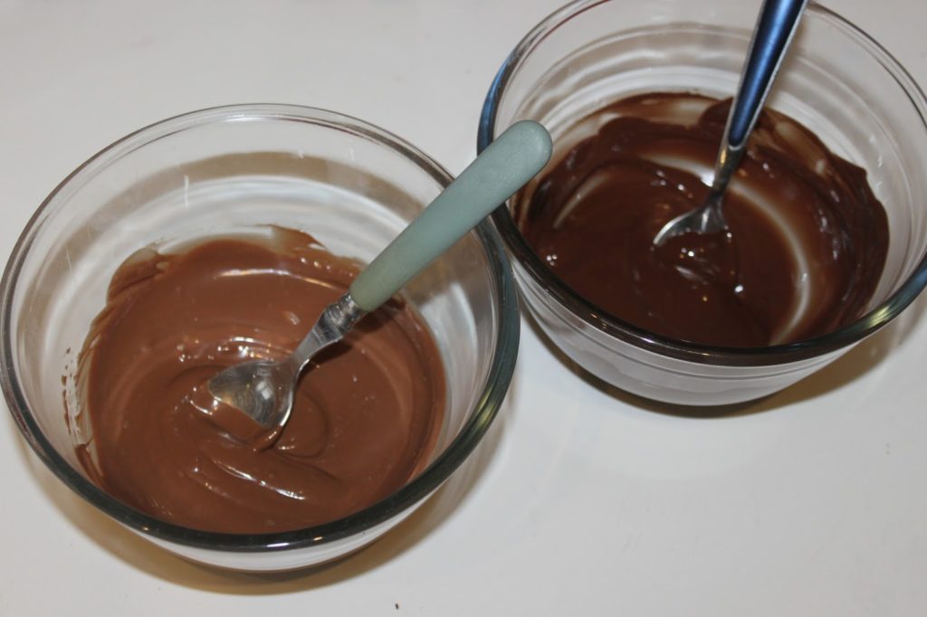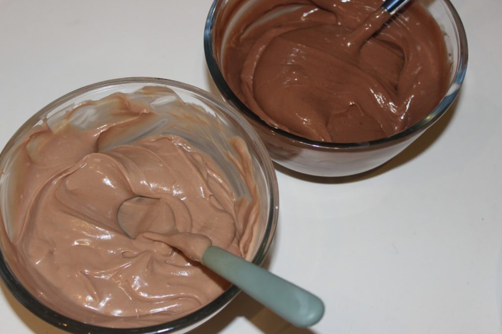 - Mettez 400g de préparation dans l’un et 400g dans l’autre et mélangez soigneusement.