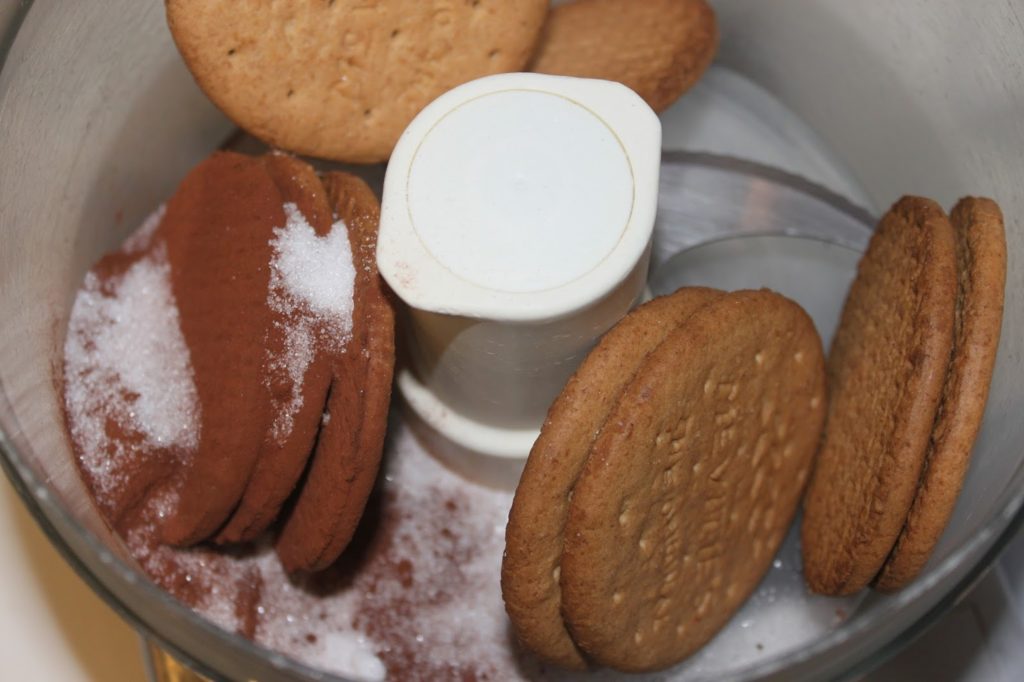 - Placez les biscuits avec le sucre et le cacao dans un mixeur pour réduire le tout en poudre.