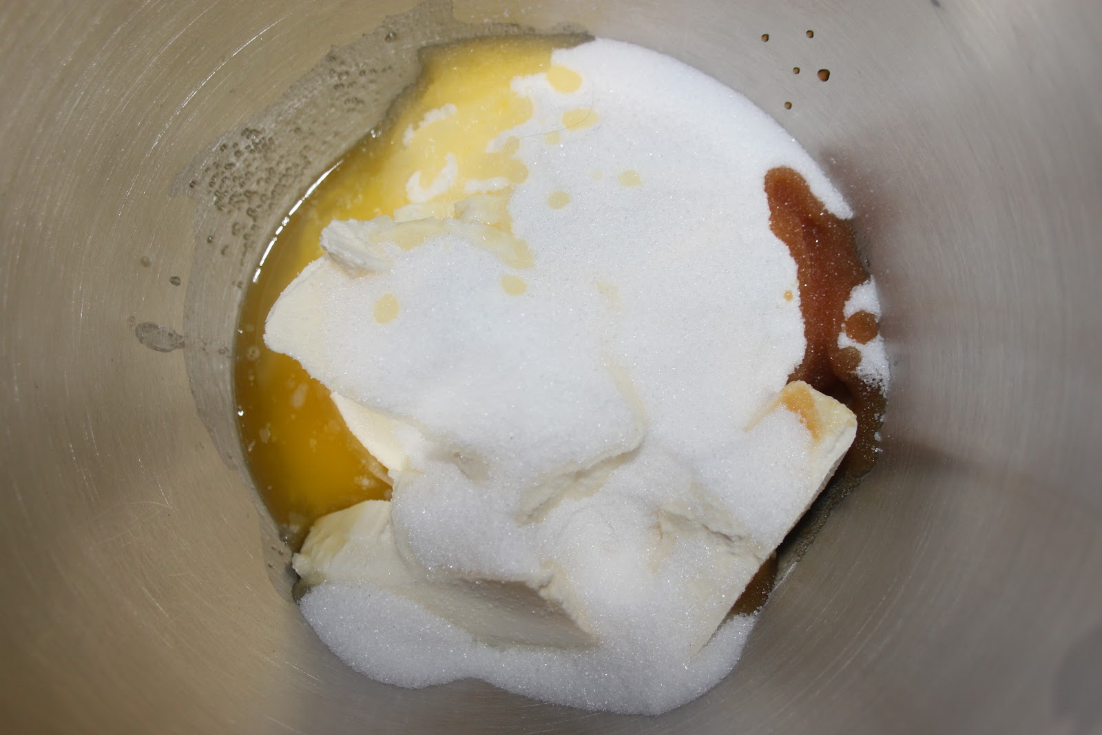 Mettre le beurre fondu, le cream cheese, la vanille liquide et le sucre dans un grand récipient ou dans le bol d’un robot (type kitchenaid ou kenwood).