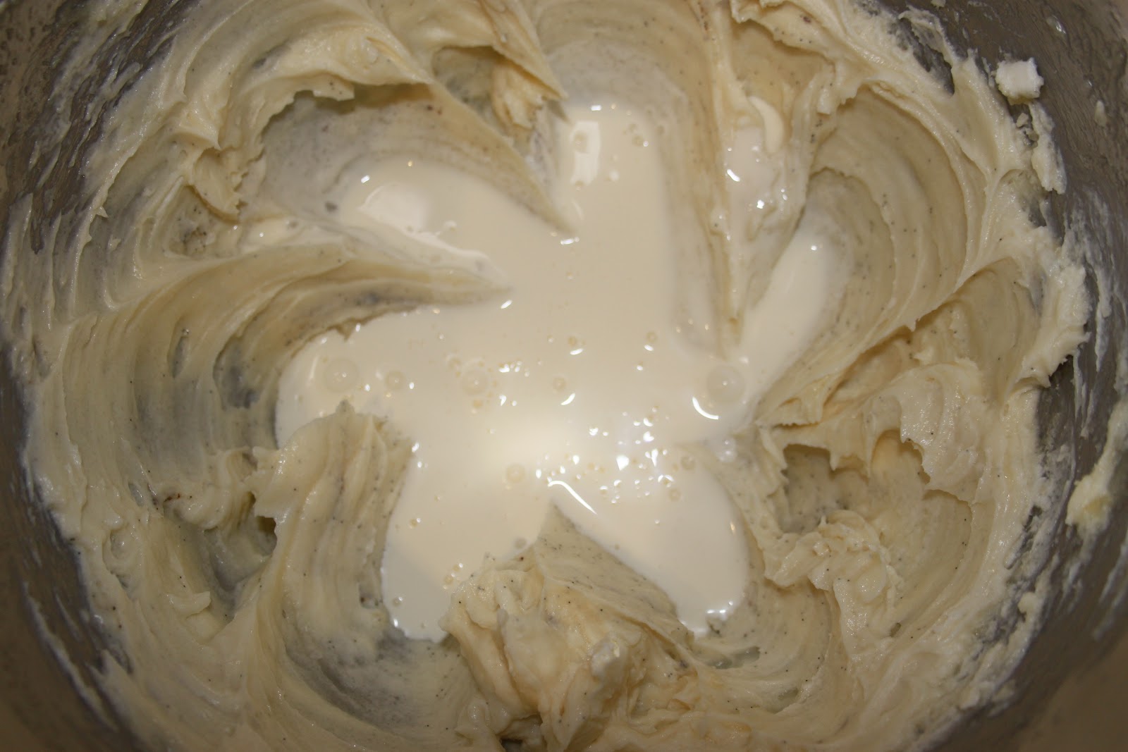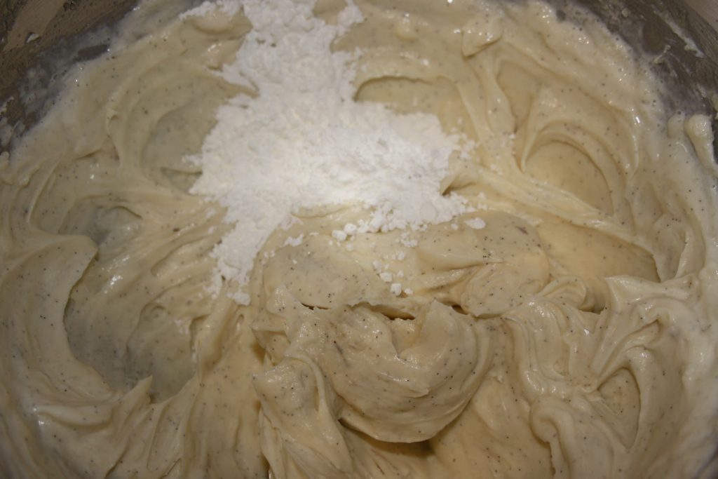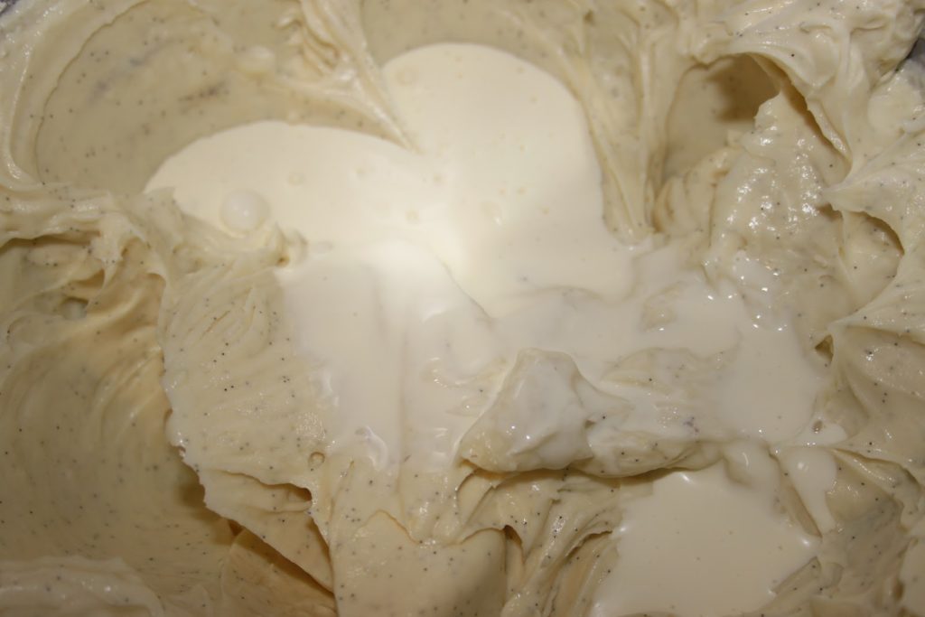 Mélanger avec jusqu’à homogénéisation du tout. Ajouter la vanilline (l’intérieur de la gousse).