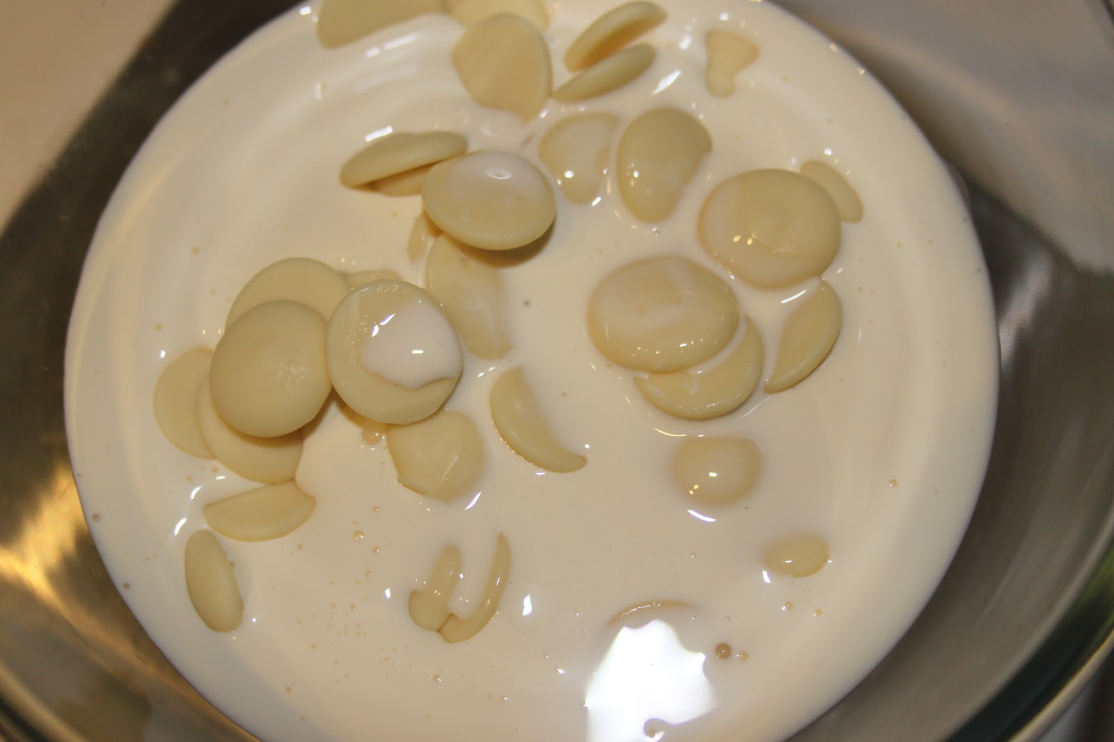 Le soir avant de se coucher, mettre la crème, le chocolat blanc et la vanille (1+1/2 gousses) dans un bol et mettre a micro-ondes dix secondes par dix secondes en mélangeant à chaque fois jusqu’à ce que le chocolat ait fondu.