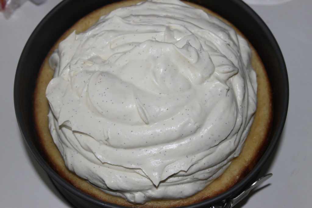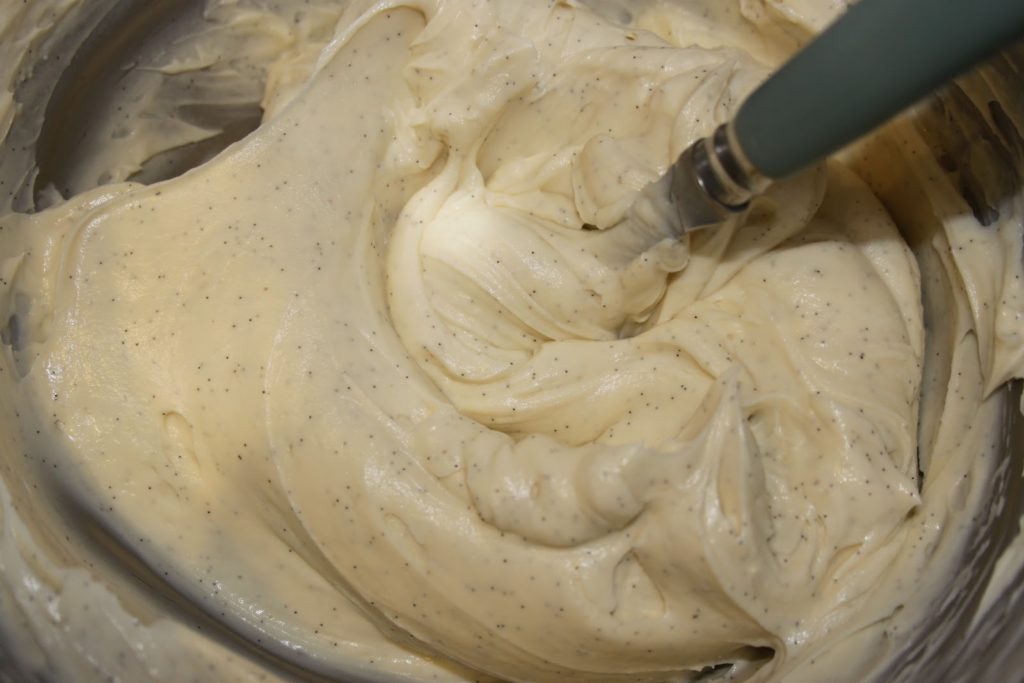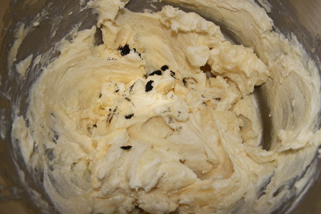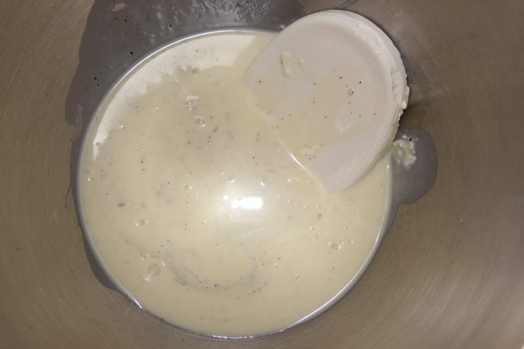 Le lendemain, mettre cette crème au chocolat blanc bien froide avec le cream cheese bien froid également. Enlever les gousses vides.