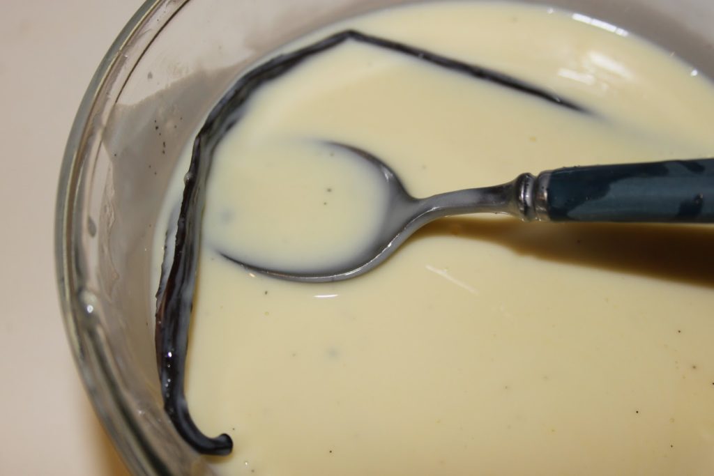 On voit ici la crème avec la vanille fendue (la vanilline est dans le bol aussi!). Mettre cette crème au frais toute la nuit également (avec un film étirable pour la protéger des odeurs).