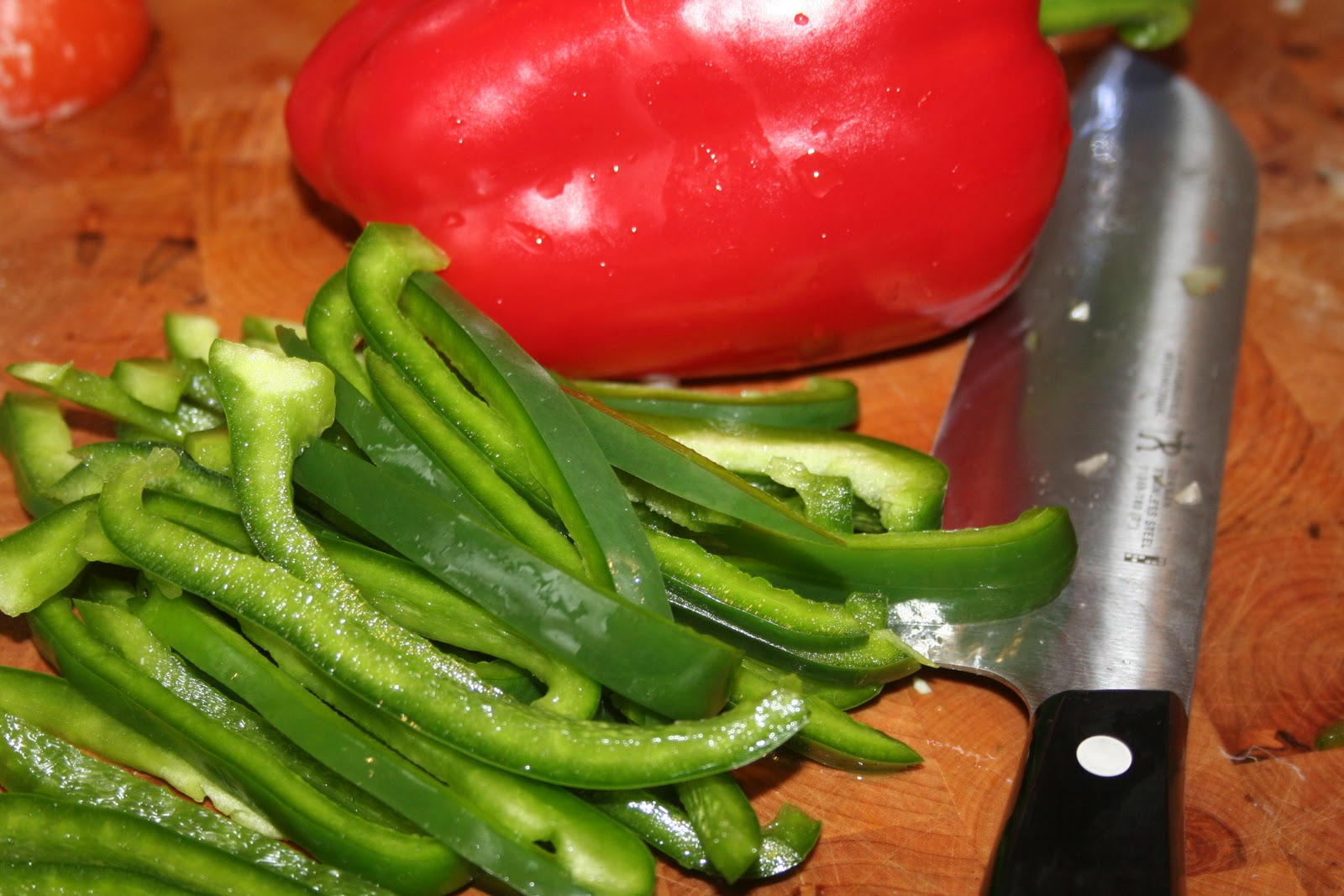 Ajouter les oignons et les poivrons dans la viande quand celle-ci est cuite. Mélanger régulièrement.