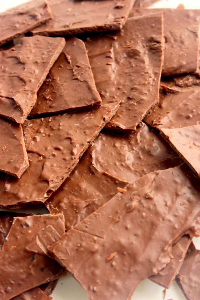 Si vous avez suivi mon « voyage culinaire » de Lausanne (vous pouvez le voir ICI), vous avez pu découvrir le chocolatier Blondel. Pour notre plus grand plaisir, celui-ci nous propose des spécialtiés de chocolats cassés au marteau. Il y en a de toutes les sortes et l’un de mes préférés (mais il y en a d’autres également incroyables) et celui au caramel. Comme Noël approche à grands pas, je vous remets en avant la méthode du chocolat tempéré au beurre de cacao Mycryo, méthode la plus simple quand on n’est pas professionnel. Il vous faudra cependant ce beurre magique,ainsi que le chocolat de couverture (qui n’est pas le chocolat du supermarché) et… c’est tout! Cette fois, cette recette se fait évidemment sans moule! Et toute la perfection de celle-ci tient dans sa parfaite irrégularité! Bien emballé, ce chocolat trouvera sans doute sa place sous le sapin!Tout d’abord, avant de commencer, il vaut mieux lire la méthode du chocolat tempéré pour bien bien comprendre de quoi il s’agit!