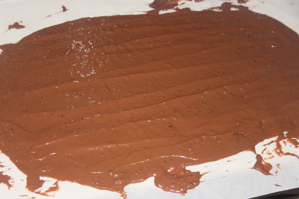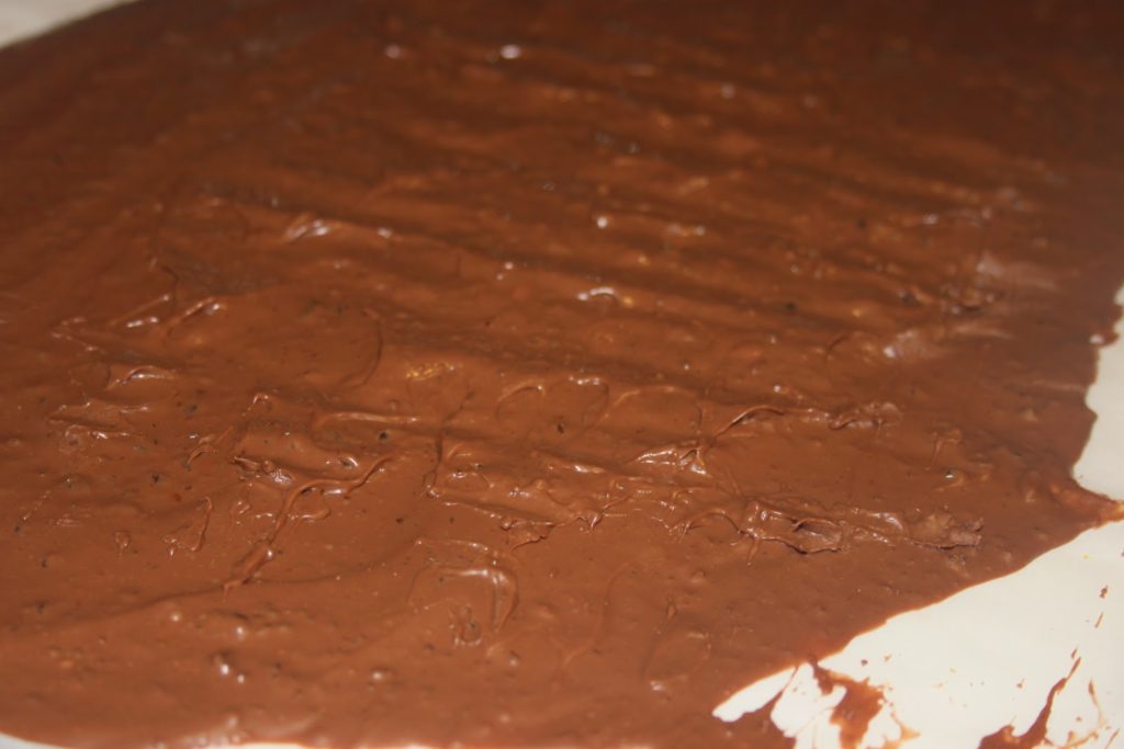 Étaler avec une spatule coudée, ou bien avec un large couteau ou une scie. De toute façon, dans cette recette, c’ets justement l’imperfection qui rend ce chocolat si attrayant!