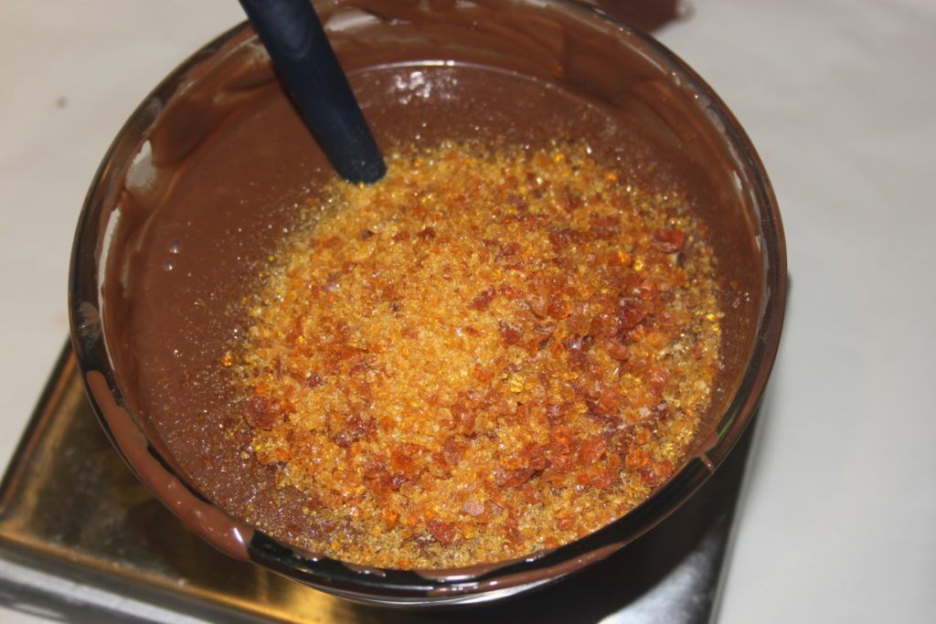 Quand le chocolat est à 31°C, ajouter les 115g de caramel en grosse poudre.