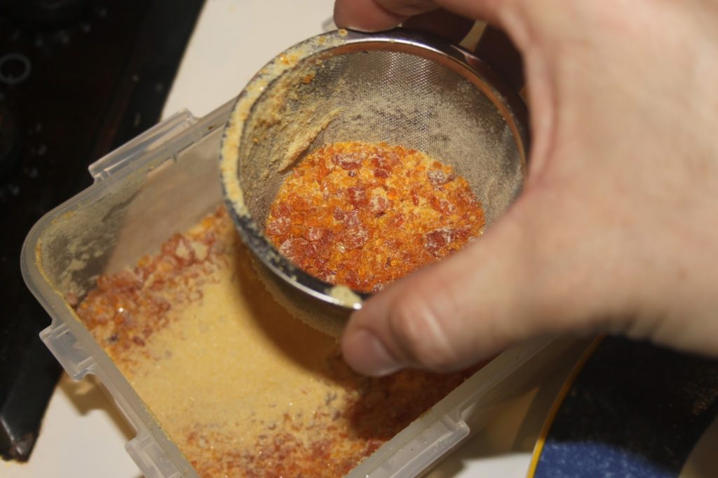 Il suffit de tamiser la poudre. On en gardera que les plus gros morceaux (qui sont quand même assez fins!). En attendant de tempérer la couverture, il faut impérativement garder le caramel dans une boite hermétique pour éviter qu’il ne se liquéfie! Il faut au moins 115g de morceaux de caramel!