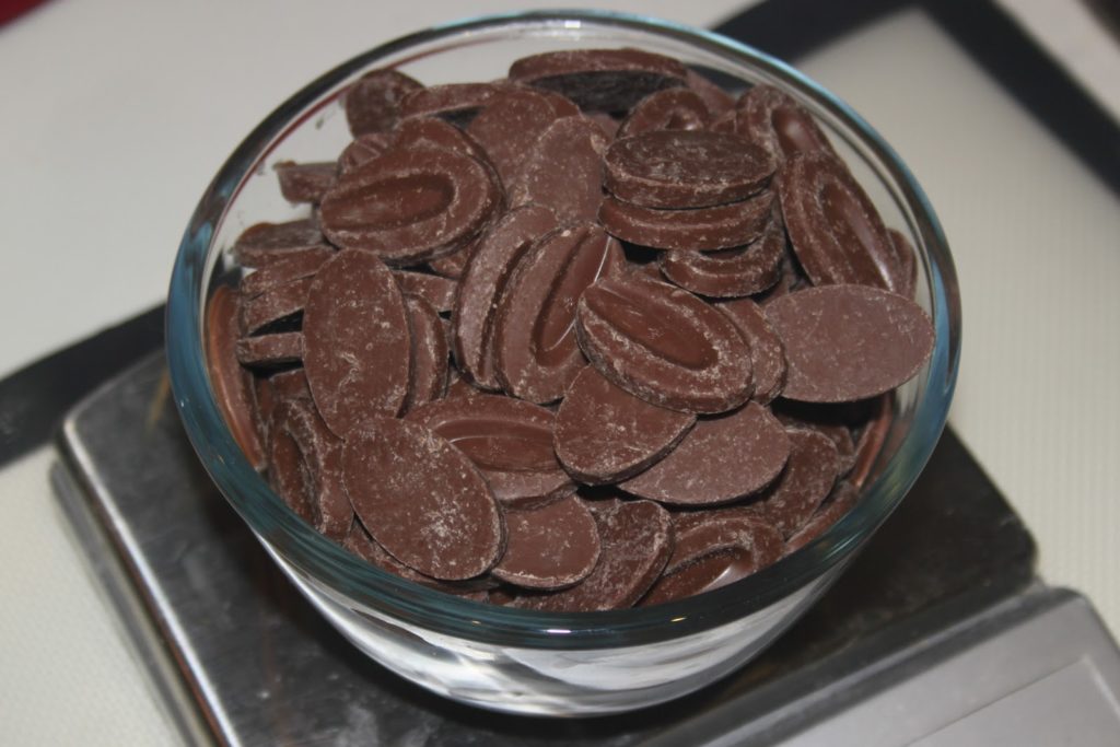 -500g de chocolat de couverture lactée ou noire tempérée (voir méthode ICI) -230g de sucre (on ne va utiliser que la moitié… voir la suite) -1/4 de cuillerée à café de sel -5g de beurre de cacao mycryo