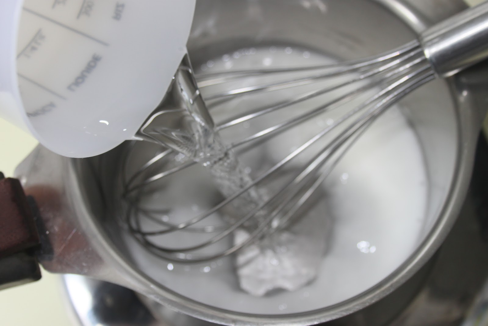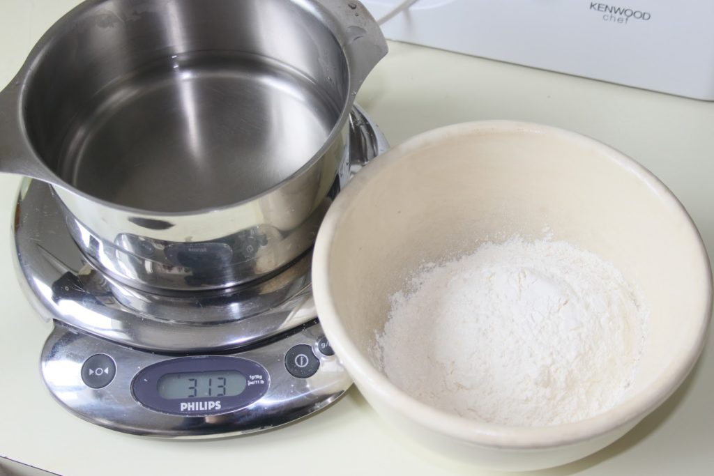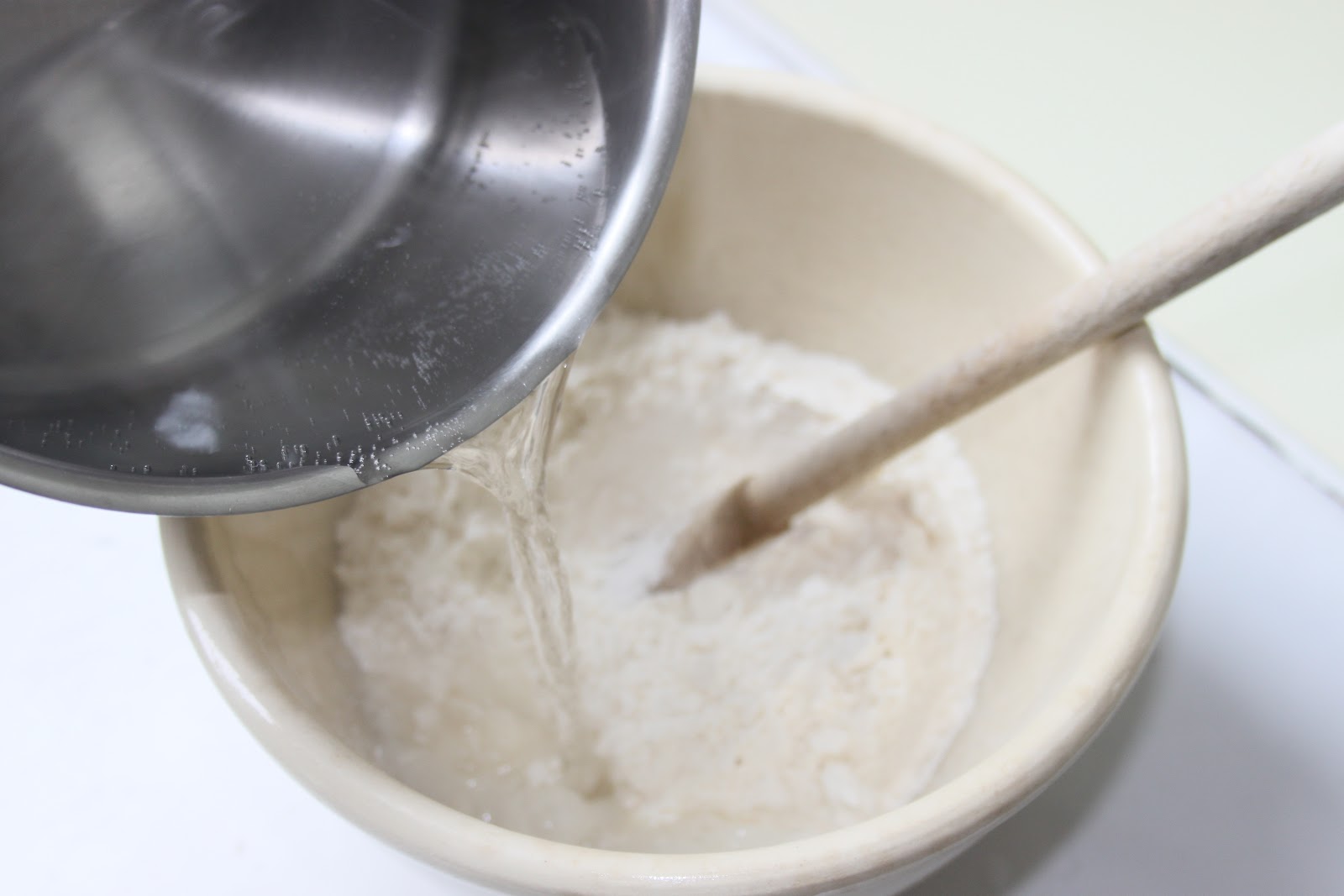 - Verser d’un coup sur la farine.