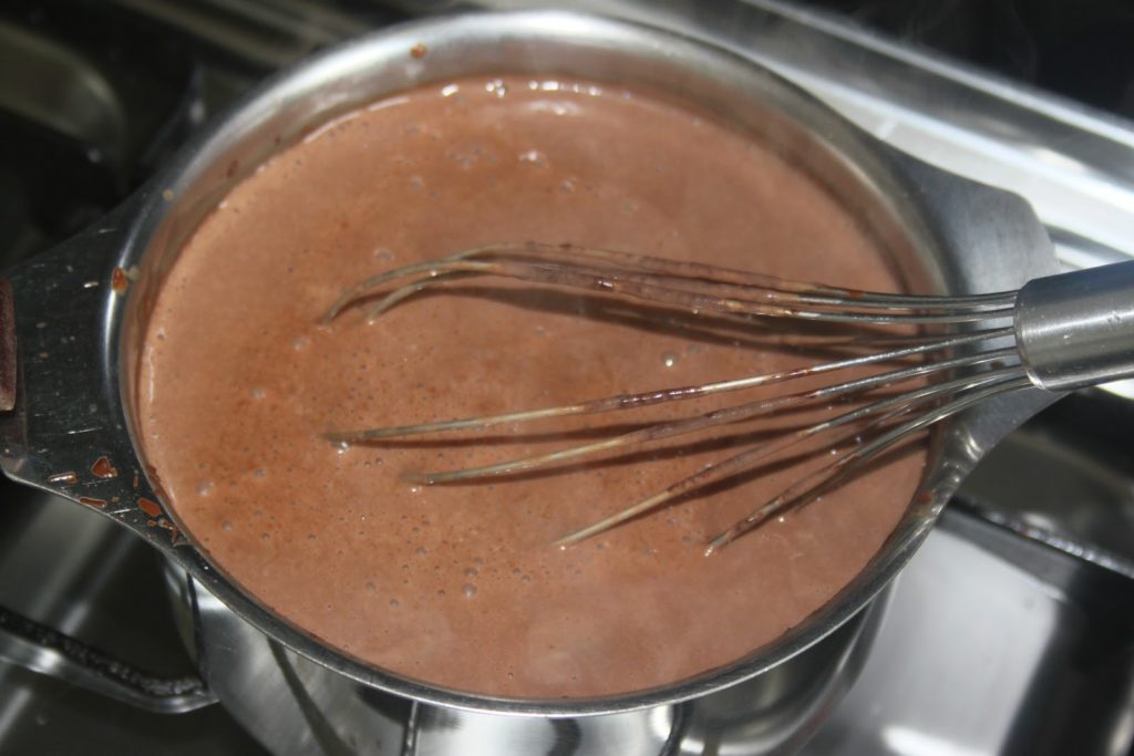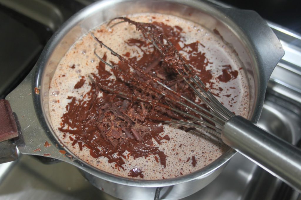 - Ajouter ensuite le reste de l’eau et le lait. On peut ajouter le café instantané pour un chocolat corsé!