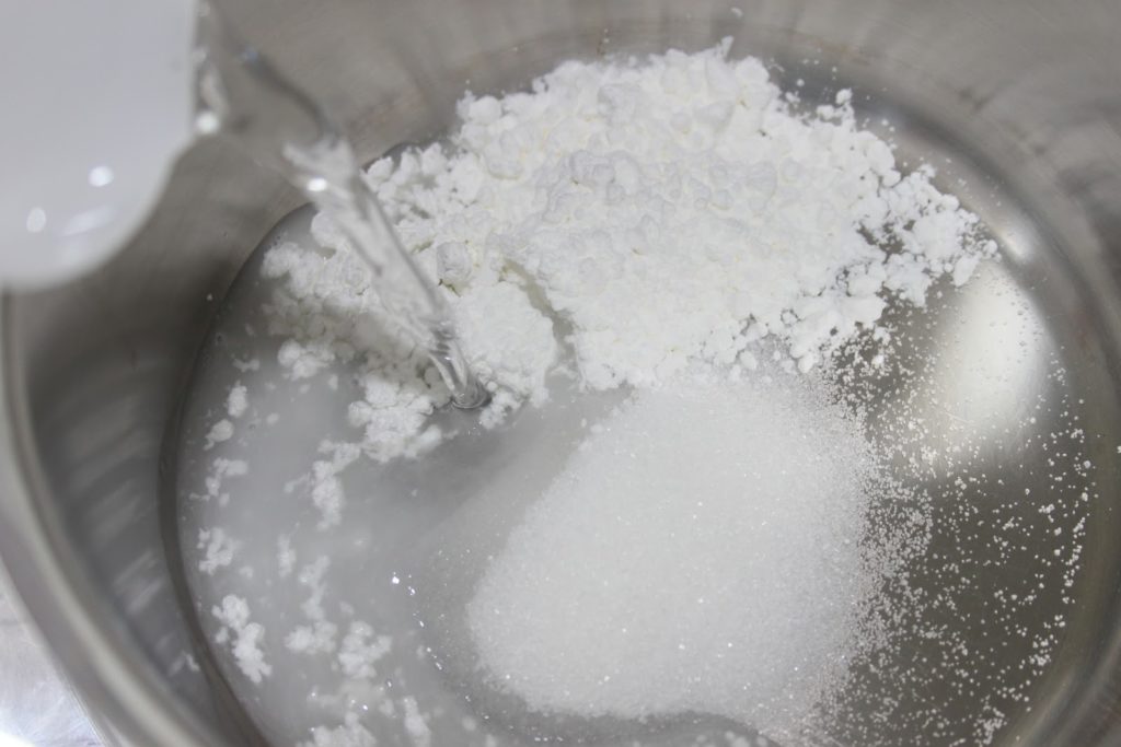 Mettre la maïzena et le sucre dans une casserole. Ajouter un peu d’eau pour dissoudre la maïzena.