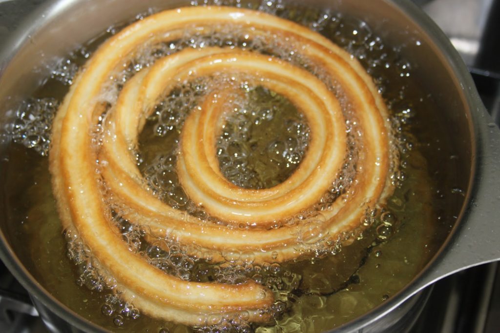 - Commencer à visser et la pâte sort toute seule. Quand l’huile est bien chaude, faire des churros de la taille désirée et les coupant avec un couteau. Avant de couper, je dévisse un peu, histoire de relâcher la pression pour que la pâte ne sorte plus trop.