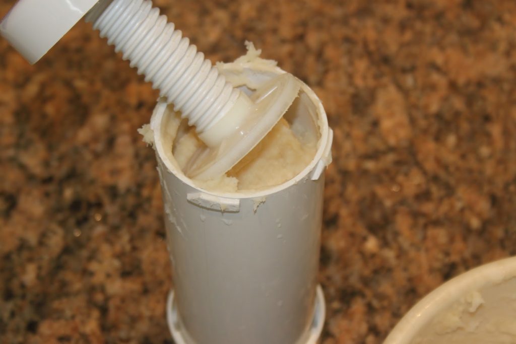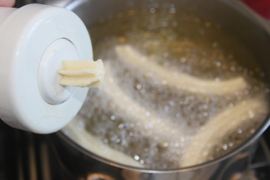 Commencer à visser et la pâte sort toute seule. Quand l’huile est bien chaude, faire des churros de la taille désirée et les coupant avec un couteau. Avant de couper, je dévisse un peu, histoire de relâcher la pression pour que la pâte ne sorte plus trop.