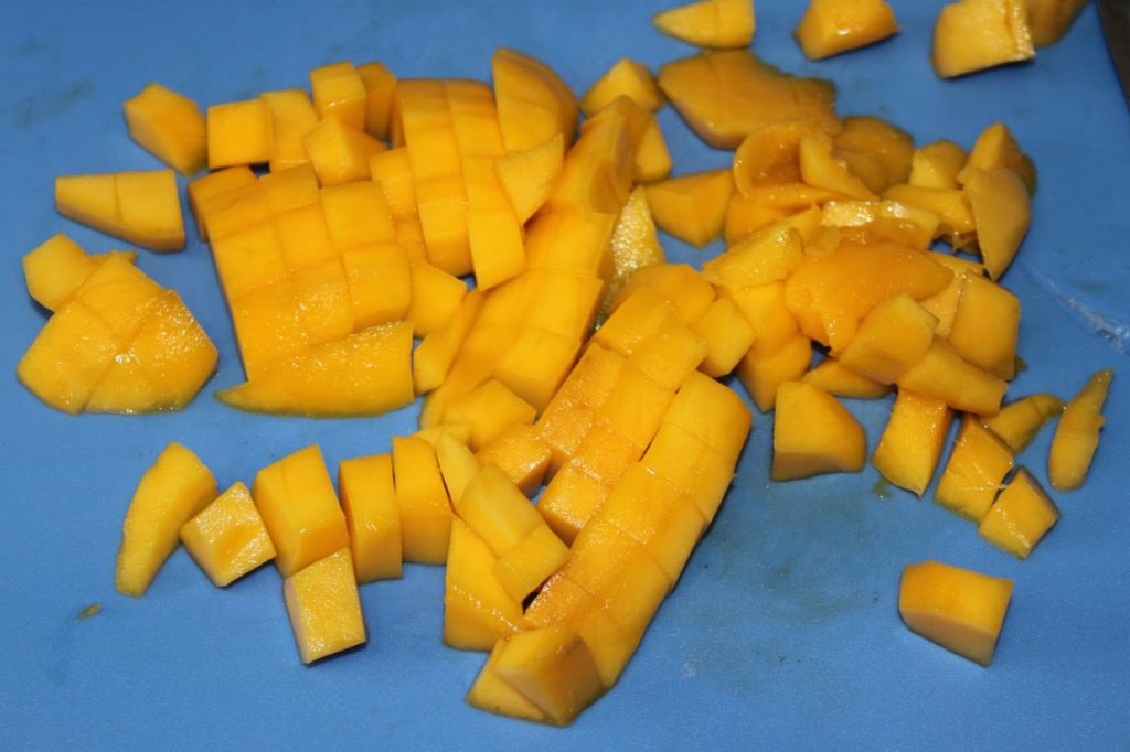 - Épluchez et coupez la mangue en morceaux.
