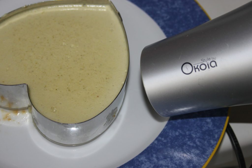 - Laisser refroidir au moins 4 heures au frais (ou mieux, une nuit).Le lendemain, décercler en chauffant tout le pourtour extérieur avec un sèche cheveux.