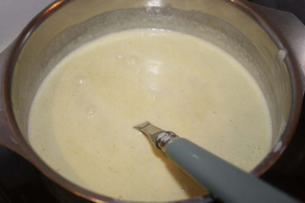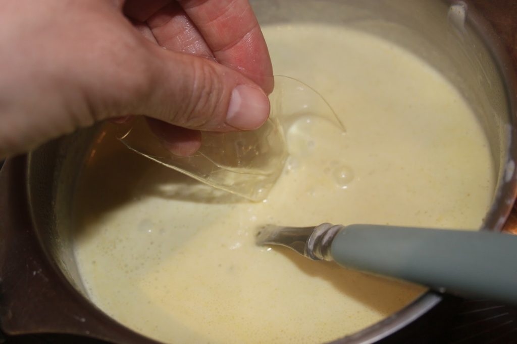 - Mettre sur feu doux et porter doucement à ébullition. Pendant ce temps, laisser tremper les feuilles de gélatine dans de l’eau froide.