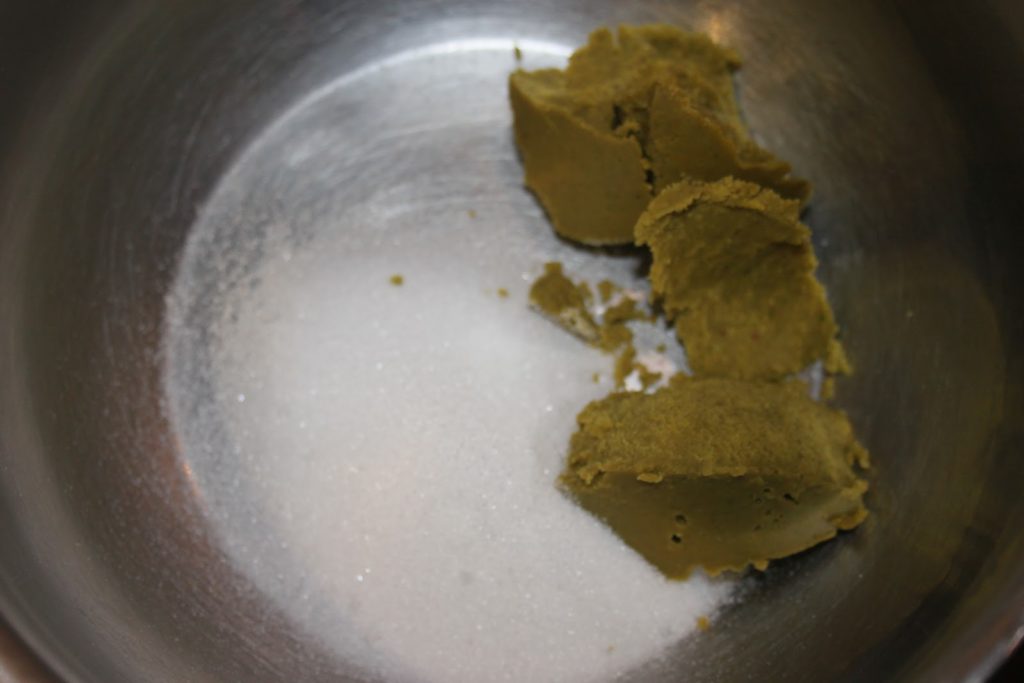 Préparer la panacotta à la pistache. Mettre le sucre et la pâte de pistache dans une casserole.