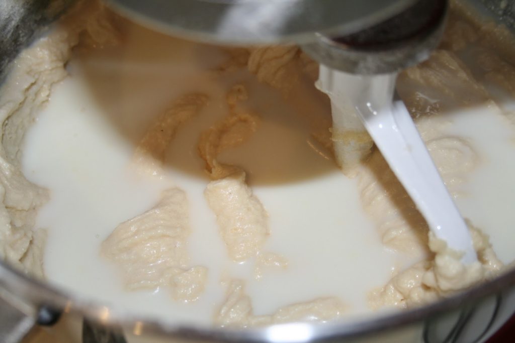 Ajouter enfin le lait et laisser tourner la feuille (c’est le « k » du kitchenaid ou du kenwood) pendant au moins 3 minutes.